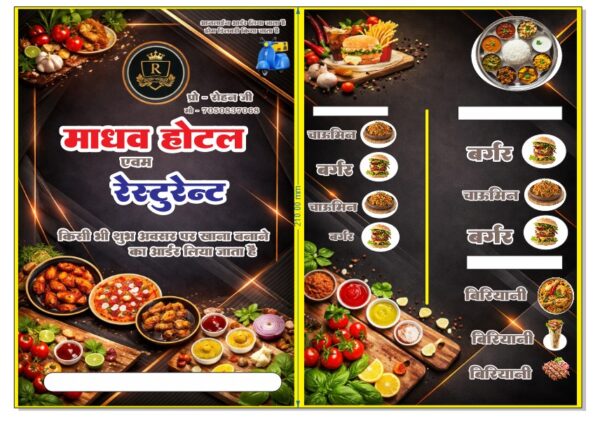 इस डिजाइन में आकर्षक लेआउट, सुंदर कलर कॉम्बिनेशन और प्रोफेशनल स्टाइल का उपयोग किया गया है, जिससे आपका मेन्यू कार्ड ग्राहकों को साफ, सुंदर और प्रभावशाली तरीके से दिखाई देता है। यह फाइल प्रिंट-रेडी है, इसलिए इसे सीधे प्रिंट के लिए भी इस्तेमाल किया जा सकता है।